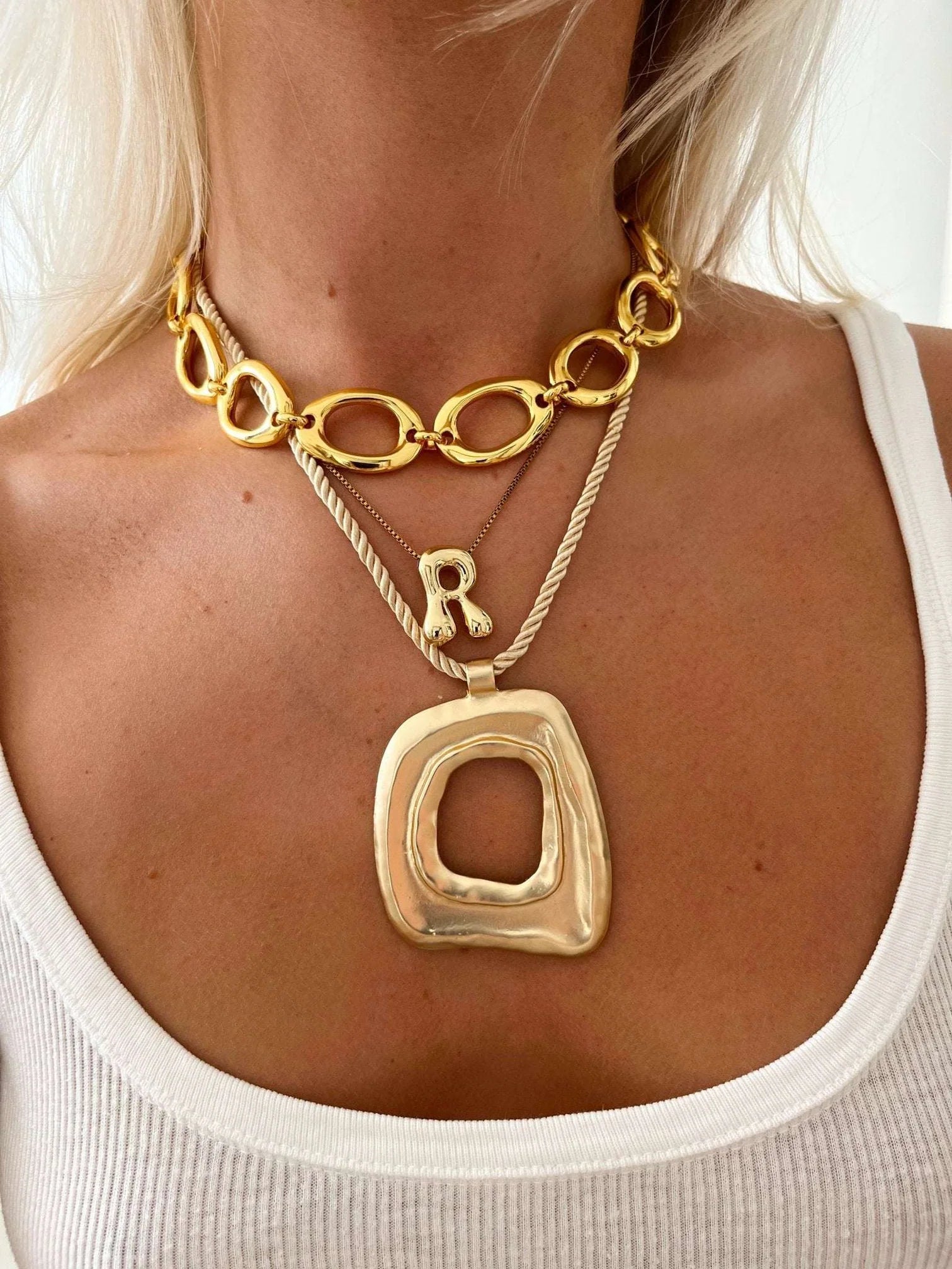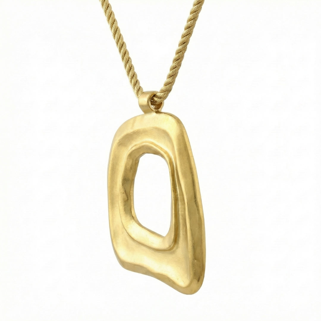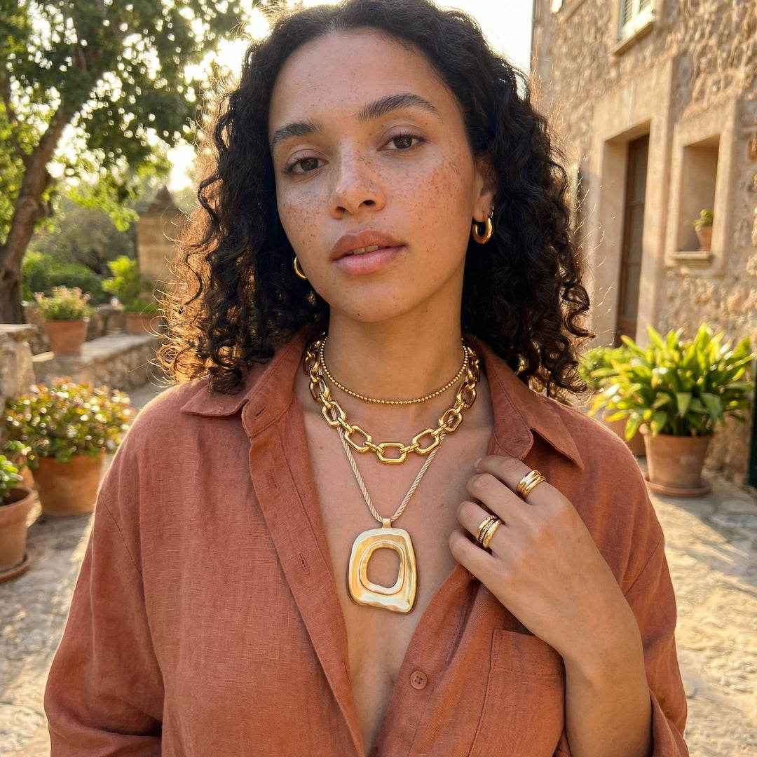 This is the piece that makes everything feel intentional. A sculptural pendant with a polished finish made to catch light, frame the neckline, and deliver that quiet-luxury look in seconds.